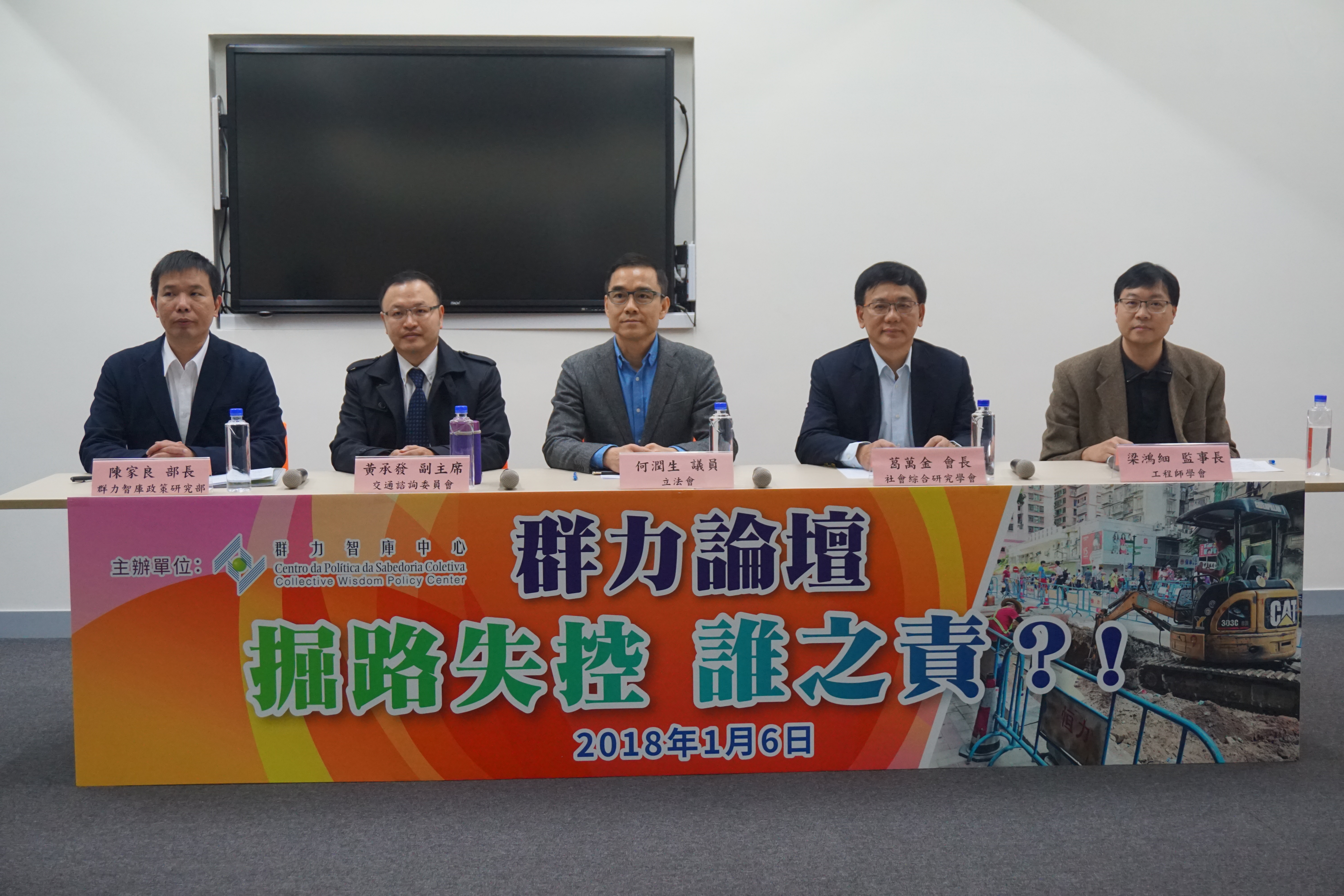 群力論壇昨日下午三時在UTV澳門網絡媒體舉行,以“掘路失控誰之責”為主題,探討困擾本澳交通多時的掘路問題。由群力智庫中心政策研究部長陳家良主持,議員兼群力智庫理事長何潤生、社會綜合研究學會會長葛萬金、交諮委副主席黃承發、工程師學會監事長梁鴻細出席探討。